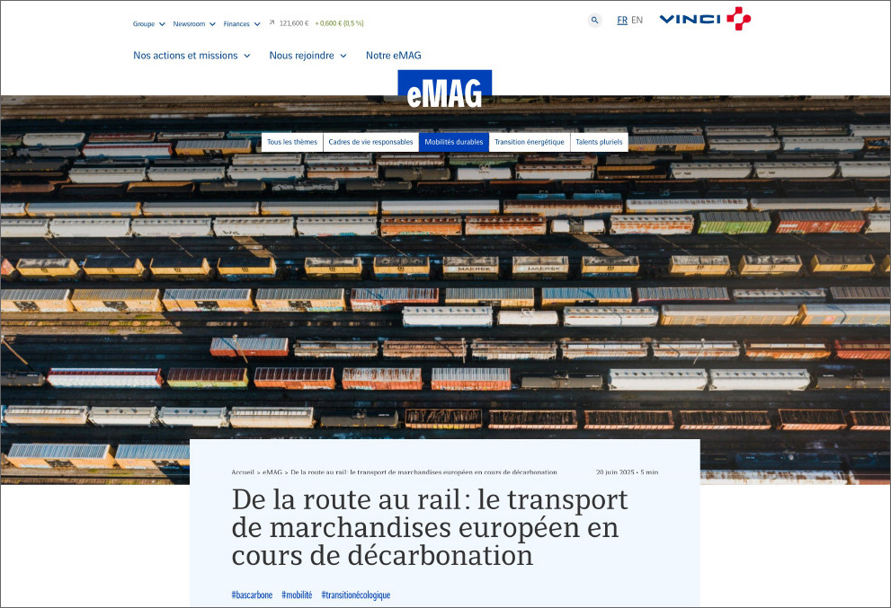 Nous rédigeons des contenus pour eMAG, le magazine en ligne du groupe VINCI. Il décrypte les défis de la transition écologique et énergétique, de la construction durable, de l’évolution des mobilités, ainsi que des questions sociales telles que l’inclusion, la diversité et l’insertion.