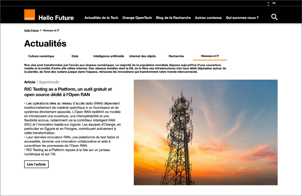 À titre d’exemple, nous réalisons des interviews et articles mensuels pour le média d’information Hello Future, plateforme de référence du Groupe Orange. Nous y valorisons l’actualité des domaines réseaux & IT, IA, IoT, recherche, data et culture numérique, en donnant la parole à des experts du secteur. Chaque contenu repose sur un travail rigoureux d’enquête, de restitution et de mise en clarté, garantissant justesse du fond, lisibilité du message et excellence éditoriale.